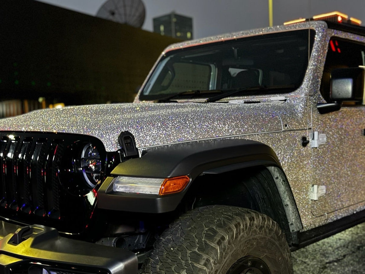 Regular wraps use printed or reflective materials. Our wraps use real crystals, hand-placed one by one over a protective vinyl base. The result is a sparkling surface that reflects light beautifully and creates a truly unforgettable look.